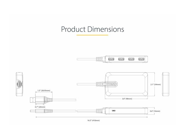 Produktbeskrivning StarTech.com 4-Port USB Hub, USB 3.0 5Gbps, Bus Powered, USB-A to 4x USB-A Hub with Optional Auxiliary Power Input, Portable Desktop/Laptop USB Hub with 1ft (30cm) Attached Cable - USB Expansion Hub (5G4AB-USB-A-HUB) - hubb - 4 portar Typ av enhet Hubb - 4 portar Undertyp USB Portar 4 x USB 3.2 Gen 1 + 1 x micro-USB Prestanda Dataöverföringshastighet: 5 Gbit/s Funktioner Drivs via USB, plasthölje, USB overcurrent detection and prevention Standarder som följs USB 3.2 Gen 1, USB 2.0, USB 1.1 Dimensioner (BxDxH) 5.4 cm x 42 cm x 1.6 cm Vikt 82 g Färg Rymdgrå Systemkrav Microsoft Windows, Apple MacOS, Linux, Apple iPadOS, Google Chrome OS, Android Tillverkarens garanti 2 års garanti -