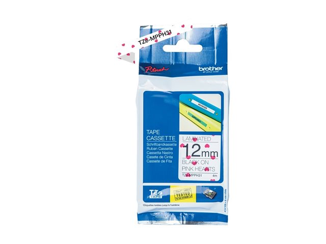 Produktbeskrivning Brother TZe-MPPH31 - bandlaminat - 1 kassett(er) - Rulle (1,2 cm x 4 m) Typ av produkt Bandlaminat Mediastorlek Rulle (1,2 cm x 4 m) Utskriftsteknik Termisk överföring Mediefärger Svart på rosa hjärtan Medföljande antal 1 kassett(er) Tillverkarens garanti 4 års garanti Kompatibel med Brother PT-H110; P-Touch PT-1290, PT-1290DT, PT-1290SBVP, PT-1290VP, PT-2030, PT-2030AD, PT-2030VP, PT-2730, PT-2730VP, PT-E310BTVP, PT-H105, PT-H105P, PT-H105WB, PT-H110, PT-H110LB, PT-P300BT, PT-P700; P-Touch Cube PT-P300BTAD; P-Touch Embellish PT-D215e -