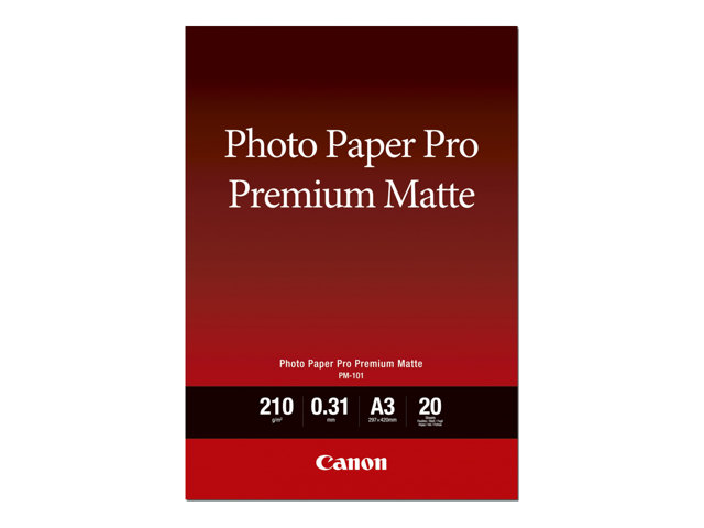 Produktbeskrivning Canon Pro Premium PM-101 - fotopapper - slät matt - 20 ark - Super A3/B - 210 g/m² Typ av produkt Fotopapper Ytbeläggning Slät matt Mediastorlek Super A3/B (330 x 483 mm) Medievikt 210 g/m² Tjocklek på medier 310 mikrometer Ljusstyrka på medier 92 Medföljande antal 20 ark Kompatibel med PIXMA PRO-1, PRO-10, PRO-100 -
