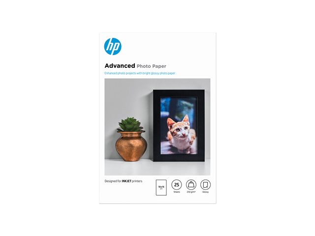 Produktbeskrivning HP Advanced Glossy Photo Paper - fotopapper - blank - 25 ark - 100 x 150 mm - 250 g/m² Typ av produkt Fotopapper Ytbeläggning Blank Mediastorlek 100 x 150 mm Medievikt 250 g/m² Medföljande antal 25 ark Kompatibel med Deskjet 21XX, 2622, 36XX; ENVY 45XX, 50XX, 76XX; ENVY Inspire 7255, 79XX; Ink Tank 319; Ink Tank Wireless 410; Officejet 38XX, 52XX, 6000, 6000 E609, 6500 E709, 68XX, 7000 E809, 75XX, 80XX; Officejet Pro 7720, 87XX; PageWide Pro 477; Photosmart B110, Wireless B110; Smart Tank Plus 55X, 571, 655 -