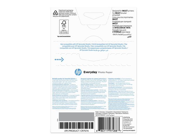 Produktbeskrivning HP Everyday Photo Paper - fotopapper - blank - 100 ark - 100 x 150 mm - 200 g/m² Typ av produkt Fotopapper Ytbeläggning Blank Mediastorlek 100 x 150 mm Utskriftsteknik Bläckstråle Medievikt 200 g/m² Tjocklek på medier 8 mil Medföljande antal 100 ark Kompatibel med Deskjet 21XX, 2622, 36XX, Ink Advantage 21XX, Ink Advantage 36XX, Ink Advantage 38XX, Ink Advantage 55XX, Ink Advantage 5645, Ink Advantage Ultra 2529; ENVY 5010; Officejet 20X, 250, 38XX, 46XX, 52XX, 6000, 6000 E609, 6500 E709, 68XX, 7000 E809, 80XX; Photosmart B110, Wireless B110 -