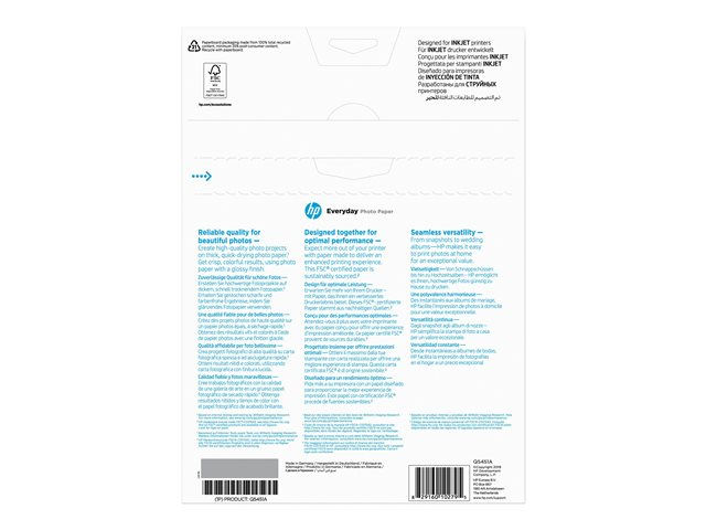 Produktbeskrivning HP Everyday Photo Paper - fotopapper - blank - 25 ark - A4 - 200 g/m² Typ av produkt Fotopapper Ytbeläggning Blank Mediastorlek A4 (210 x 297 mm) Utskriftsteknik Bläckstråle Medievikt 200 g/m² Tjocklek på medier 8 mil Medföljande antal 25 ark Kompatibel med Deskjet 21XX, 2622, 36XX, Ink Advantage 21XX, Ink Advantage 36XX, Ink Advantage 38XX, Ink Advantage 5575, Ink Advantage 5645, Ink Advantage Ultra 2529, Ultra Ink Advantage 2029; Officejet 20X, 38XX, 46XX, 52XX, 6000, 6000 E609, 6500 E709, 68XX, 7000 E809, 80XX; Photosmart B110, Wireless B110 -