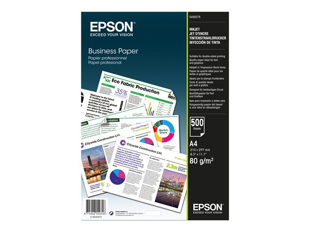 Produktbeskrivning Epson Business Paper - vanligt papper - 500 ark - A4 - 80 g/m² Typ av produkt Vanligt papper Mediastorlek A4 (210 x 297 mm) Utskriftsteknik Bläckstråle Medievikt 80 g/m² Medföljande antal 500 ark Kompatibel med Epson L382, L386, L486; EcoTank ET-16500, 2600, 2650, 2750, 2751, 2756, 2850, 2851, 2856, 3750, 4750, 4850, 7700, 7750, L14150, L1455, L15150, L6460, L6490, M3170; Expression Home XP-342, 442; Expression Photo XP-970; Expression Premium XP-540, 900; WorkForce Pro RIPS WF-C879, WF-8090, C5790, C869 -
