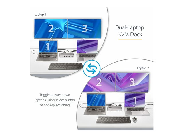 StarTech.com Dual-Laptop USB-C KVM Docking Station, Dual Monitor 4K 60Hz DisplayPort Dock, 5-Port USB Hub, GbE, 90W/45W Power Delivery to Two Laptops, Windows/Mac, 2-Host KVM Dock