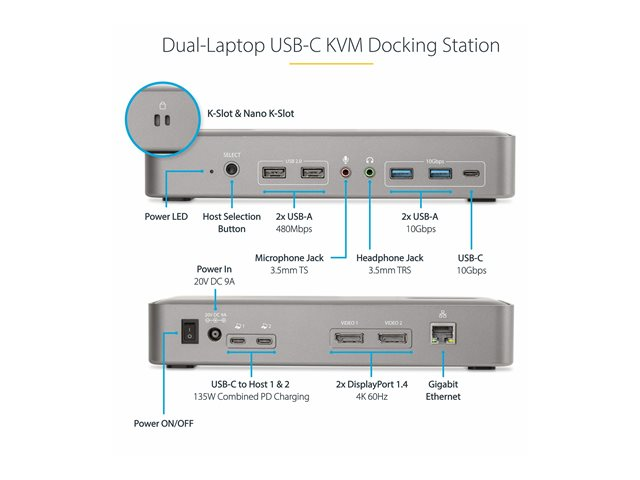 Produktbeskrivning StarTech.com Dual-Laptop USB-C KVM Docking Station, Dual Monitor 4K 60Hz DisplayPort Dock, 5-Port USB Hub, GbE, 90W/45W Power Delivery to Two Laptops, Windows/Mac, 2-Host KVM Dock - dockningsstation - USB-C 3.2 Gen 2 - 2 x DP - 1GbE - TAA-kompatibel Typ av produkt Dockningsstation Dockningsgränssnitt USB-C 3.2 Gen 2 Videogränssnitt 2 x DP Dimensioner (BxDxH) 9 cm x 22.4 cm x 4 cm Vikt 402 g Lokalisering Europa, Storbritannien Nätverk Gigabit Ethernet Strömtillförsel Strömadapter 180 Watt AC 100-240 V (DC 20 V) TAA-kompatibel Ja Tillverkarens garanti 3 års garanti -