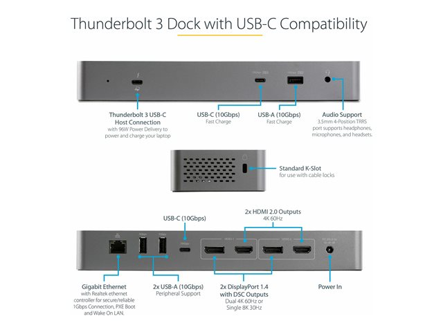 Dubbla 4K 60Hz DisplayPort 1.4- eller dubbla HDMI-skärmar - Singel 8K - TB3/USB-C dockningsstation för bärbar dator - 96 W PD, 5xUSB - 10 Gbit/s - dockningsstation - USB-C 3.2 Gen 2 / Thunderbolt 3 - 2 x HDMI, 2 x DP - 1GbE