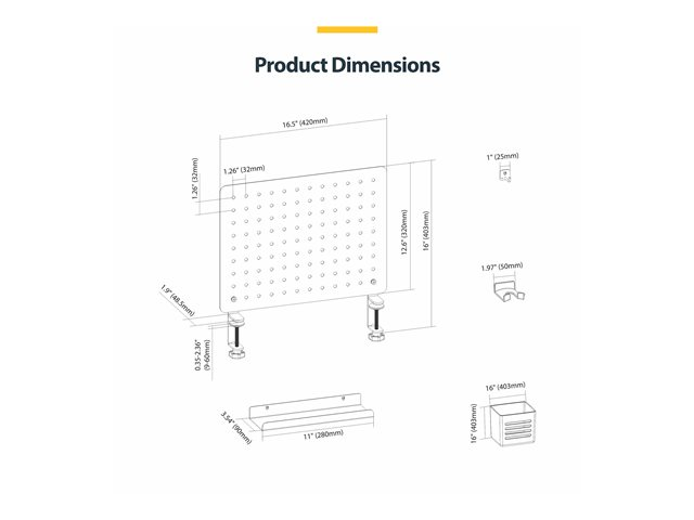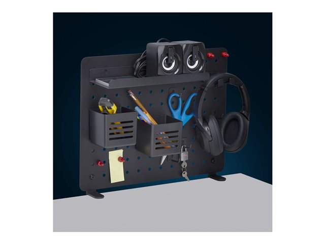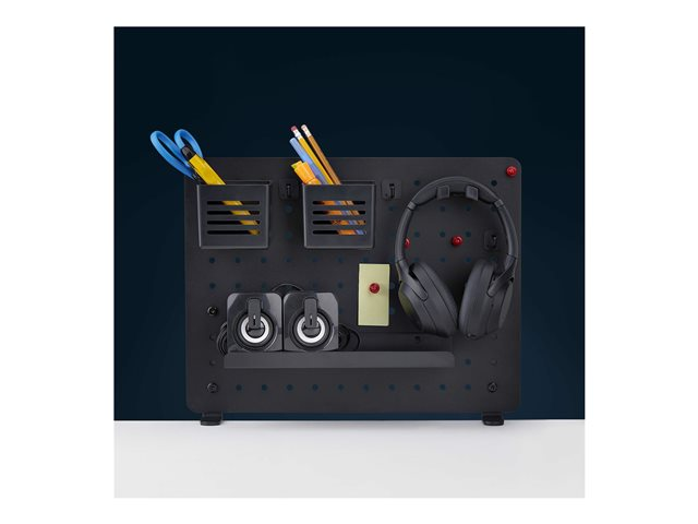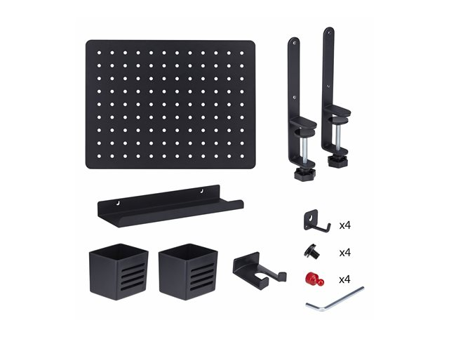 Produktbeskrivning StarTech.com Clamp-On Pegboard with Accessories, 16.5 x 12.5in (42 x 32cm), Steel Pegboard, Desktop Storage Organizer, Desk Mount Peg Board, Black monteringskomponent - klämskruv - svart Typ av produkt Monteringskomponent (klämskruv) - disk-monteringsbar Monteringskomponenter Pegboardpanel Dimensioner (BxDxH) 42 cm x 48.5 cm x 32 cm Vikt 2.6 kg Material Stål Färg Svart Förpackningens innehåll Headset hanger, 4 x hooks, 4 x magnets, 2 x containers, 4 x holders, 2 x desk clamps Tillverkarens garanti 2 års garanti -