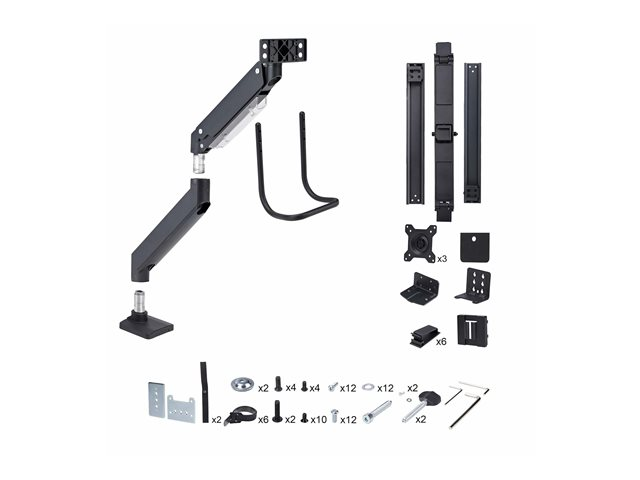 Produktbeskrivning StarTech.com Crossbar Triple Monitor Desk Mount, VESA 75x75/100x100 monteringssats - justerbar arm - för 3 LCD-bildskärmar - trippel monitormontage - svart Typ av produkt Monteringssats (justerbar arm) - disk-monteringsbar Dimensioner (BxDxH) 63 cm x 140 cm Justerbar höjd 26.5-59.5 cm Lutning -15° till 5° Rotation 360° Svängtapp -10° till 10° Justeringar Vridstift, förlängning Vikt 8.4 kg Rekommenderad användning 3 LCD-bildskärmar Rekommenderad TV-storlek 17"-27" VESA-infästningsgränssnitt 100 x 100 mm, 75 x 75 mm Maxlast 6 kg Material Aluminium, stål, plast Färg Svart Förpackningens innehåll Monteringsbas, base pad, spring arm, svängbar arm, 3 x crossbars, 3 x VESA monitor mounts, grab handle, tool holder, 2 x desk clamp discs, 2 x desk clamps, 2 hand knobs, 10 x counter-sink screws, 4 x button head screws, 2 x M4x10 screws, insexnyckel (3mm), insexnyckel (4 mm), insexnyckel (6 mm), 12 st. M4x12-skruvar, 12 x M5x12 screws, 2 x M5x8-skruvar, 12 x washers, 2 x washers (small), 8 x hook and loop straps, 6 x kabelhanteringsklämmor Tillverkarens garanti 5 års garanti -