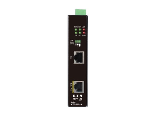 Eaton Tripp Lite Series Industrial Gigabit Ethernet PoE injector, 60W PoE++, 802.3bt, Midspan, -40C to +75C, IP30 housing, Dual 24~57VDC , DIN rail, 1 Port