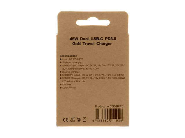 45 Watt - 3 A - PD/PPS - 2 utdatakontakter (24 pin USB-C)