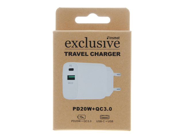 Produktbeskrivning Insmat travel charger strömadapter - USB, 24 pin USB-C - 20 Watt Typ av produkt Strömadapter Dimensioner (BxDxH) 4.2 cm x 2.4 cm x 4.3 cm Typ av utkontakt Total 2: USB, 24 pin USB-C Nätspänning AC 100-240 V Tillförd spänning 5 / 9 / 12 V Max elektrisk ström 3 A Snabbladdningsteknik Power Delivery 3.0, Qualcomm Quick Charge 3.0 Effekt 20 Watt Strömenhetsinformation - 24-stifts USB-C - 5 V - 3 A
