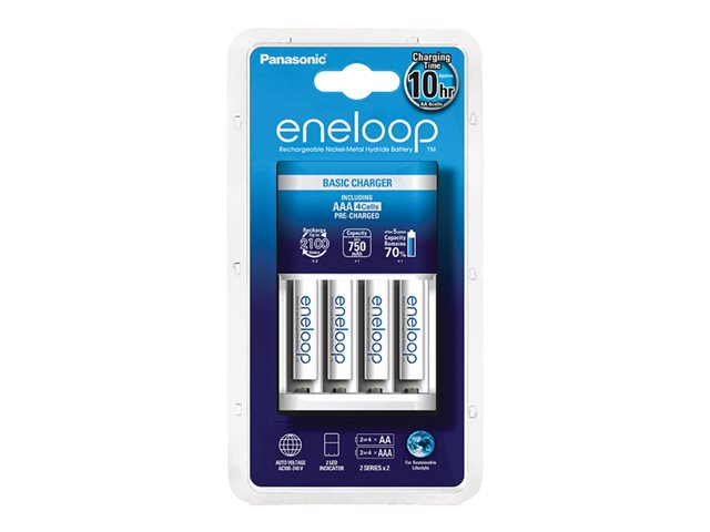 Produktbeskrivning Panasonic Eneloop basic CC18 batteriladdare - 4 x AAA - NiMH Typ av produkt Batteriladdare (för 4xAA/AAA) Nätspänning AC 100-240 V Batteri AAA-typ - nickelmetallhydrid - 750 mAh Inkluderade batterier 4 delar -