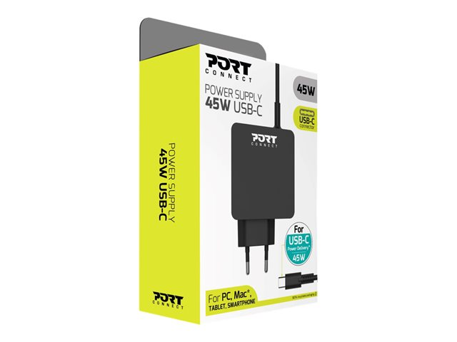 Produktbeskrivning PORT Connect - Retail - strömadapter - 45 Watt Typ av enhet Strömadapter - extern Vikt 185 g Lokalisering Europa Inspänning AC 100-240 V Utspänning 5 / 9 / 12 / 15 / 20 V Effektkapacitet 45 Watt Inmatningsanslutningar 1 x ström Typ C Utdatakontakter 1 x 24 pin USB-C Dimensioner (BxDxH) 6.1 cm x 2.8 cm x 6.1 cm Tillverkarens garanti 2 års garanti -